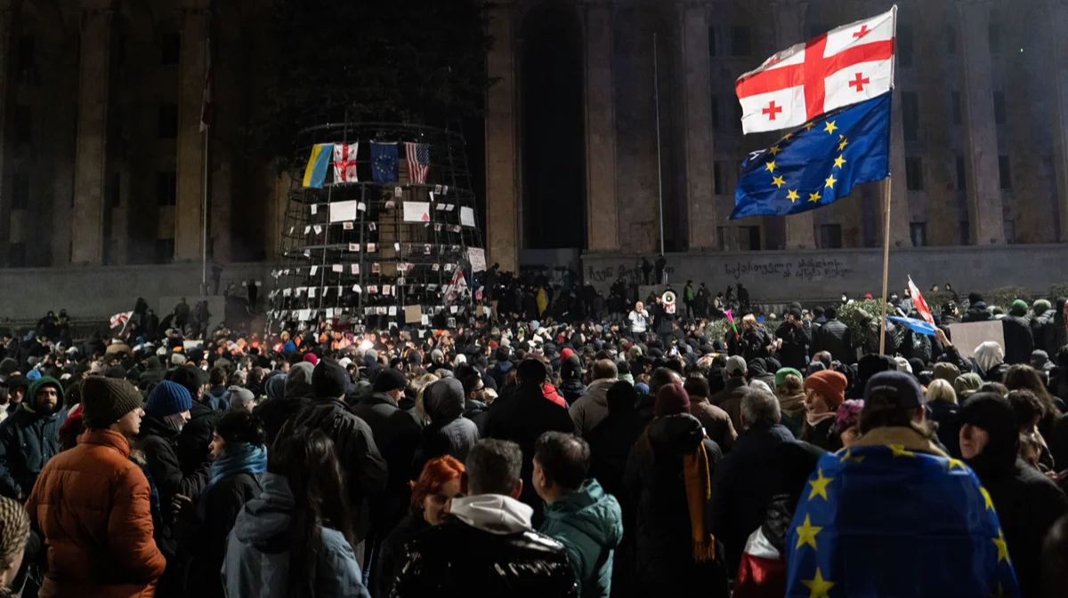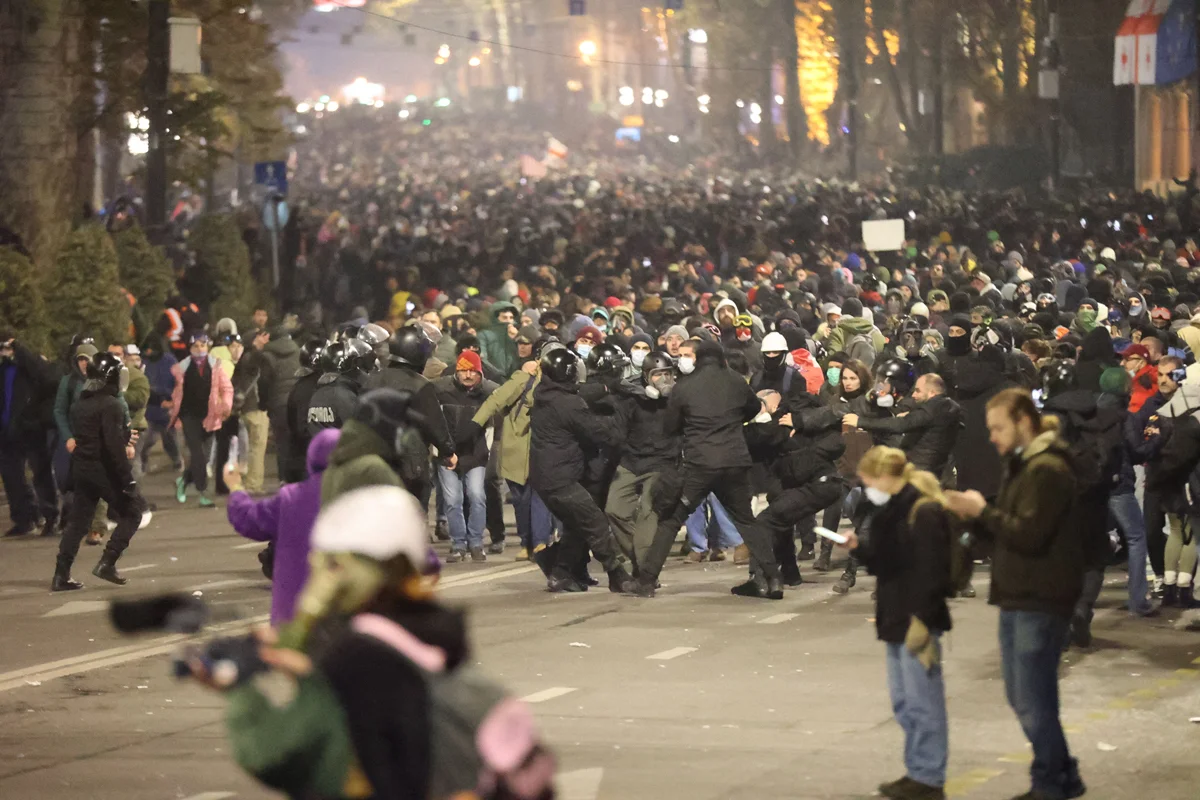 Участники антиправительственной акции у здания грузинского парламента в Тбилиси, Грузия, 8 декабря 2024 года. Фото: Jerome Gilles / NurPhoto / Shutterstock / Rex Features / Vida Press