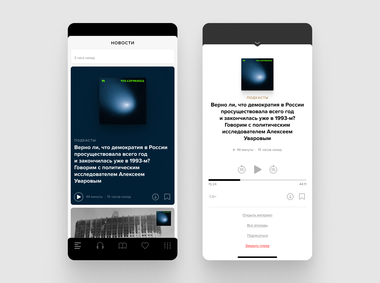 Можно перематывать прямо на шторке, а еще слушать частями и продолжать с того же места, где остановились. Раньше эти функции работали плохо, но мы все починили.