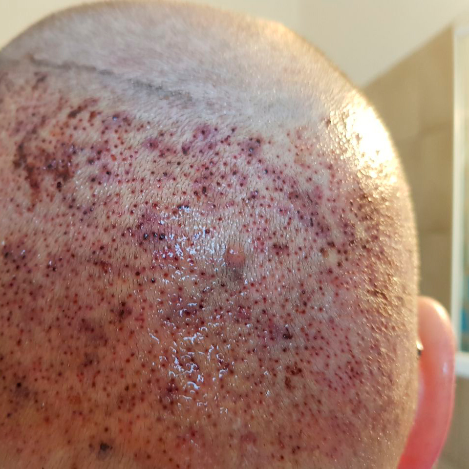 Еще месяца полтора-два после пересадки голова выглядит не очень красиво. На месте пересаженных волос возникают струпья: вокруг ранок начинает расти коричневая сухая кожа. Вся голова покрывается коростой, которая постепенно отваливается. В это время нужно аккуратно мыть голову под очень слабым напором воды. Желательно пользоваться детскими шампунями, чтобы не навредить волосами.