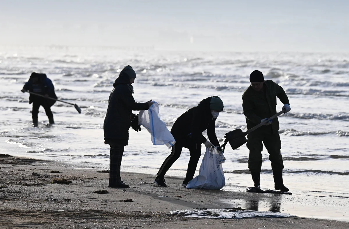 Волонтёры убирают черноморское побережье от разлива мазута после крушения танкеров в Черном море недалеко от Анапы, Краснодарский край, 21 декабря 2024 года. Фото: Сергей Пивоваров / Reuters / Scanpix / LETA