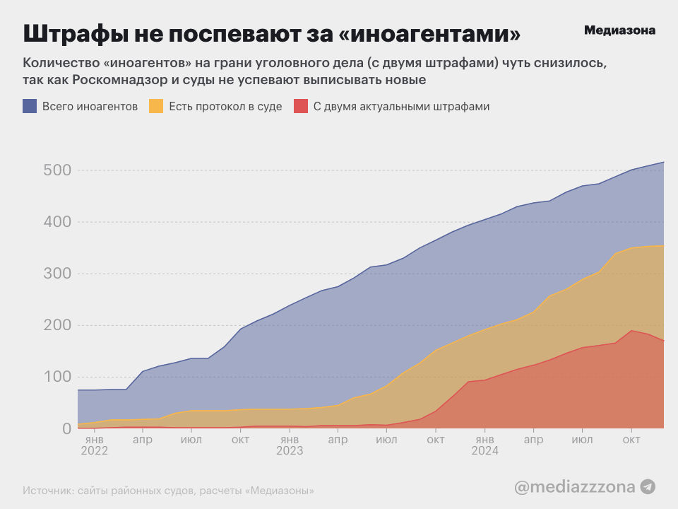 По подсчетам «Медиазоны», к октябрю 2024 года 190 «иностранных агентов» имели по два таких штрафа за последний год. К концу декабря их число снизилось до 170 — то есть с первого штрафа прошло уже больше года, а Роскомнадзор не подал в суд очередной протокол либо суд не успел его рассмотреть.