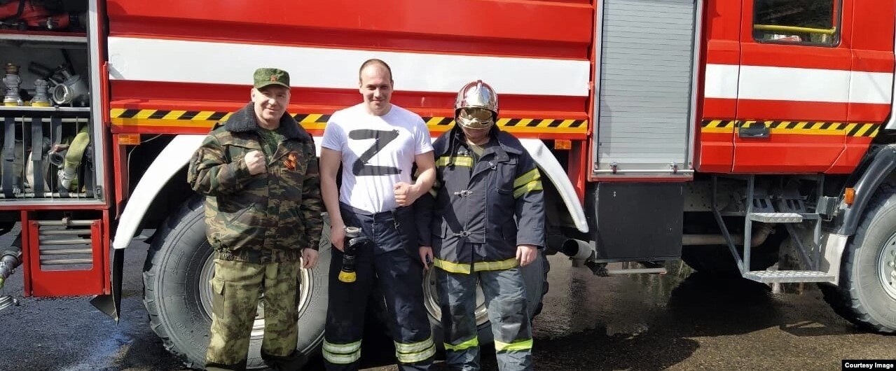 На одной из фотографий Анатолий Филинцев стоит в футболке с буквой Z на фоне пожарной машины.