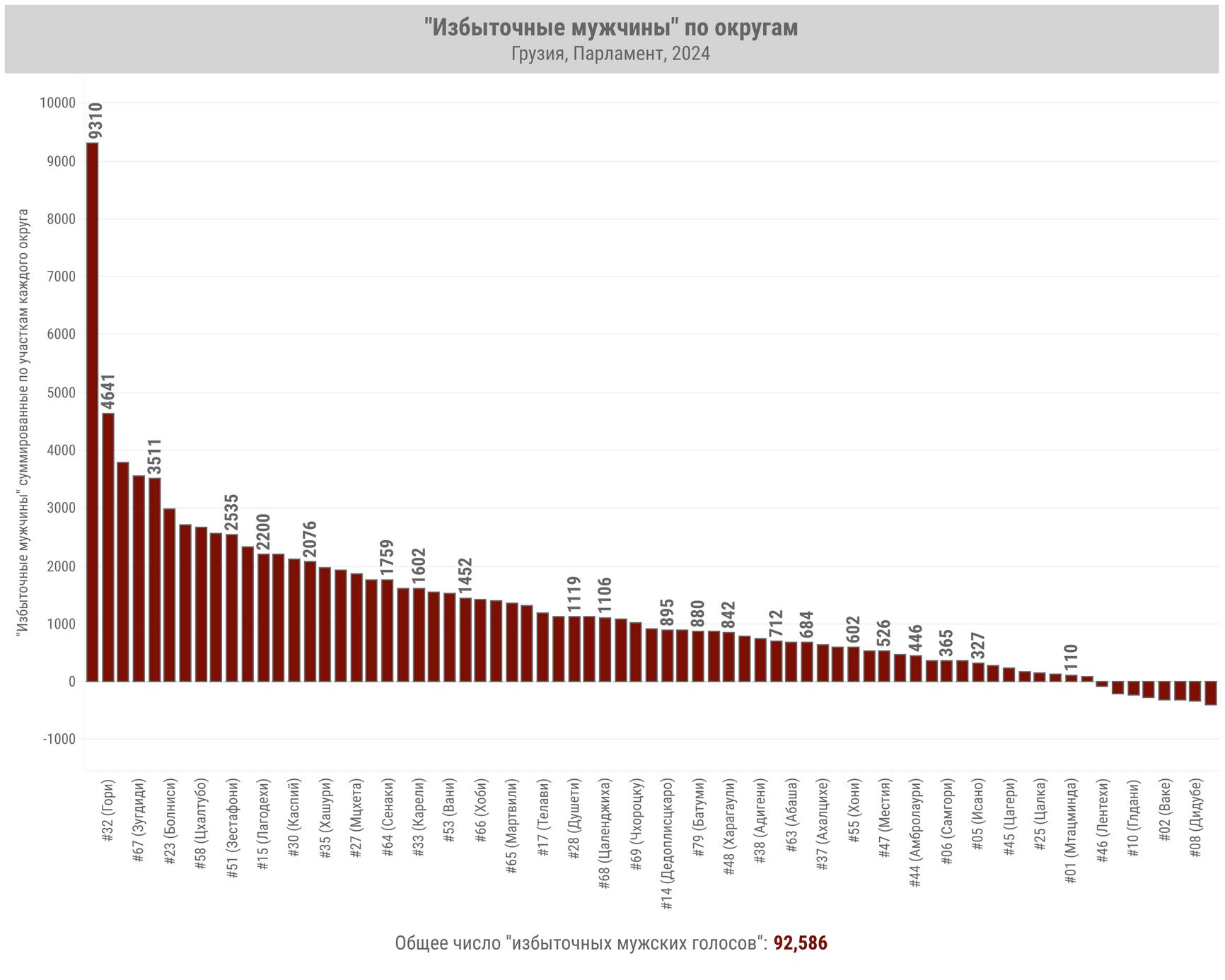 Распределение «мужской гиперактивности» по избирательным округам Грузии показано на инфографике ниже. Максимальный вклад внес Марнеульский район (юго-восток страны на границе с Азербайджаном), где число «аномальных избирателей-мужчин» достигло 9 310.