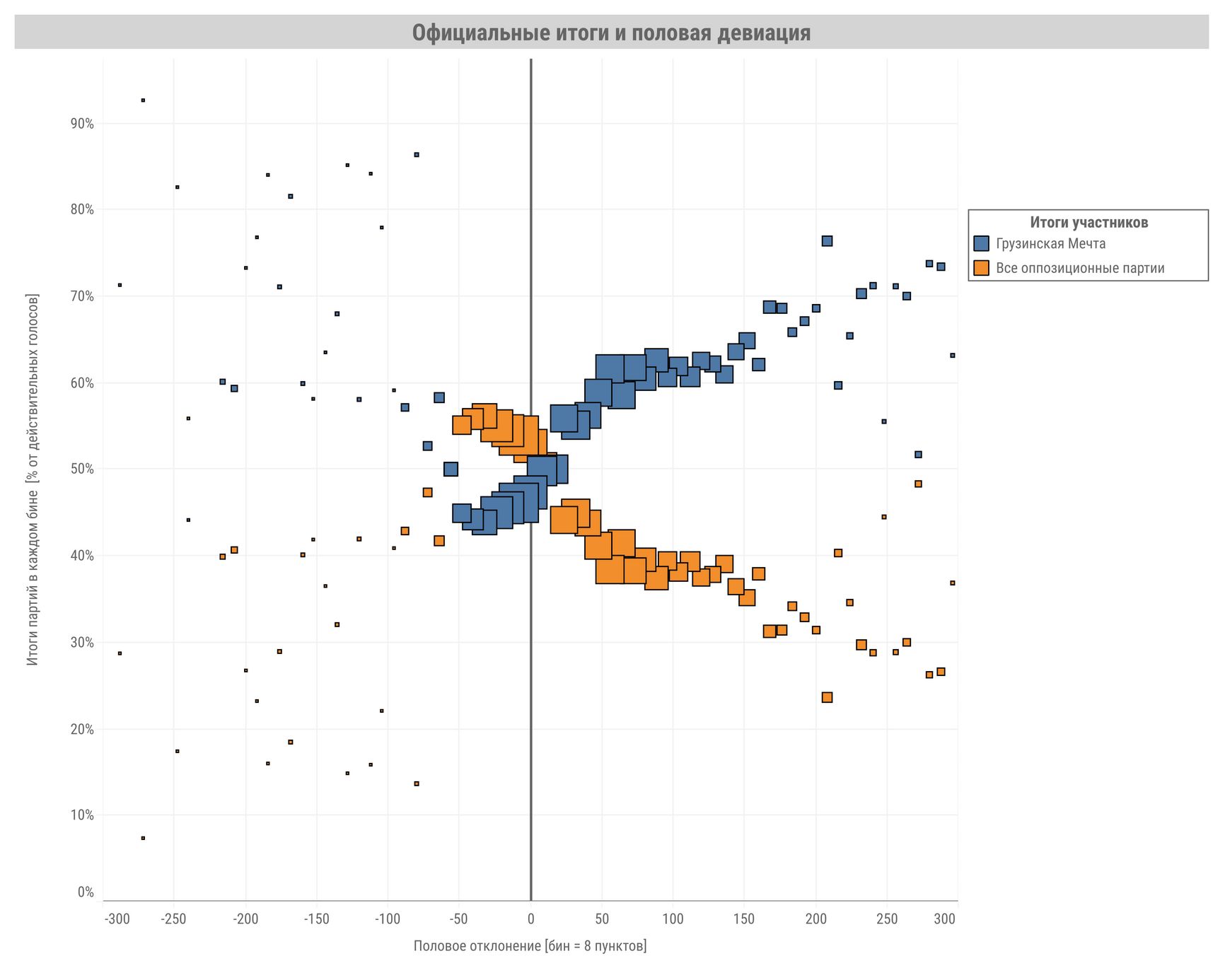 По вертикальной оси отложены результаты «Грузинской мечты» и оппозиционных партий, подсчитанные как процент от действительных голосов в каждом бине (статистики пользуются термином «бин», от англ. bin — ящик).