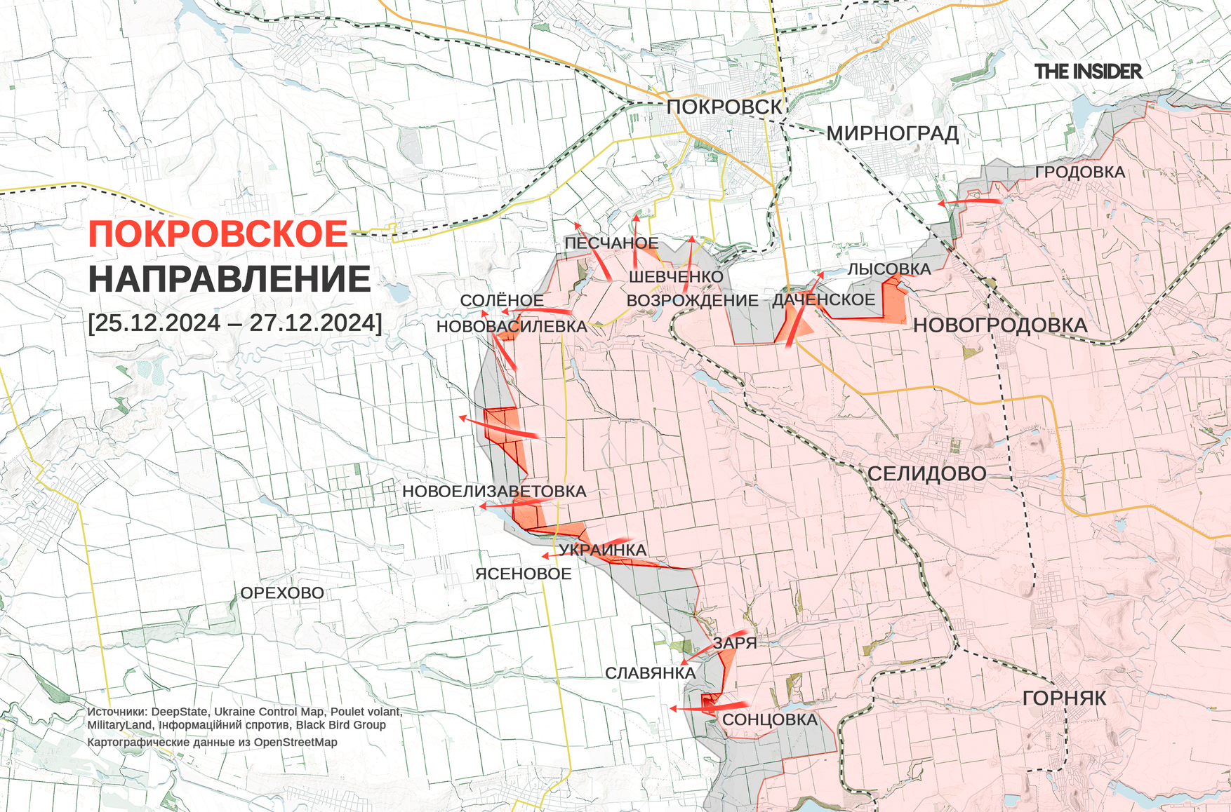 DeepState сообщает, что российские войска заняли Украинку, а также продвинулись около Даченского, Лысовки, Песчаного, Нововасилевки и Новоелизаветовки на покровском направлении.