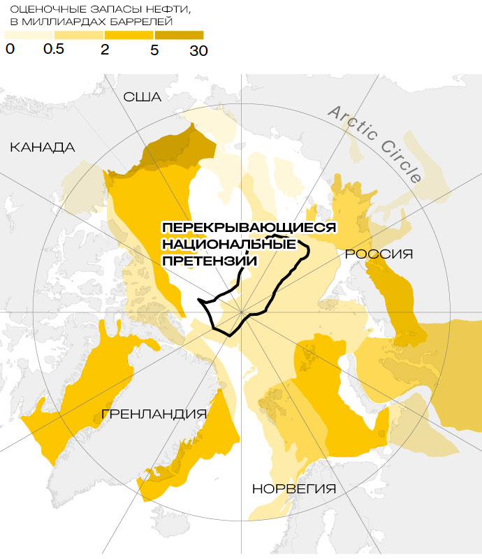 Совокупная площадь Арктики составляет 27 миллионов квадратных километров — это, к примеру, почти 90% площади Африки. Из них около 2,8 миллиона квадратных километров — нейтральные территории, России принадлежит 4,8 миллиона квадратных километров, остальную часть делят семь государств НАТО — Канада, Дания, Финляндия, Исландия, Норвегия, Швеция и США. Западная граница российских территорий начинается от границы с Норвегией, а восточная определяется по Берингову проливу.