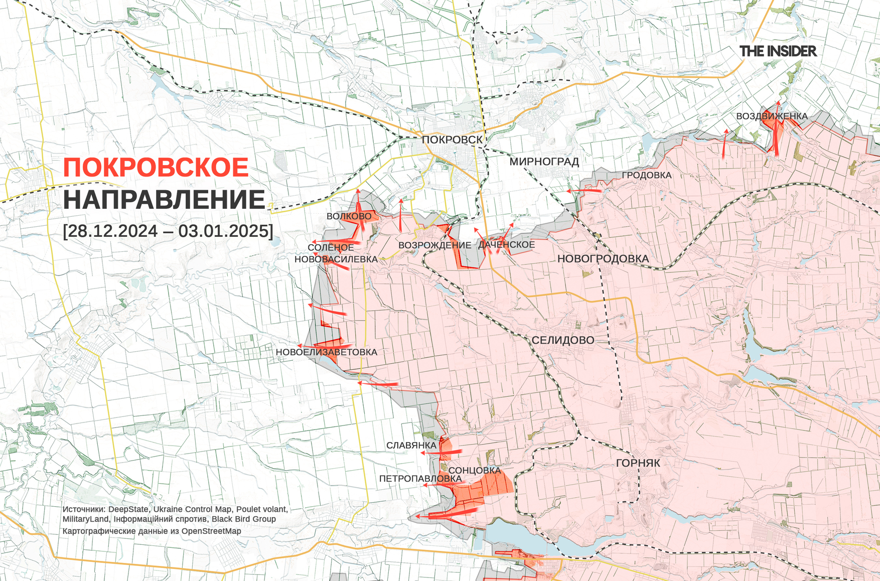 31 декабря 2024 года DeepState фиксировал продвижение российских войск в районе Славянки, Петропавловки, Солёного и Волкова на покровском направлении, а также в городе Курахове.
