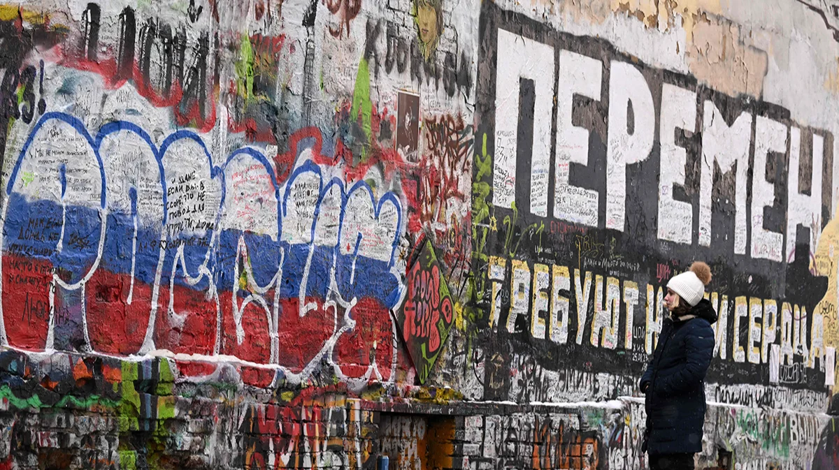 «Стена Цоя» в центре Москвы и строчка из песни Кино «Хочу перемен», Москва 7 декабря 2023. Фото: Наталия Колесников / AFP / Scanpix / LETA