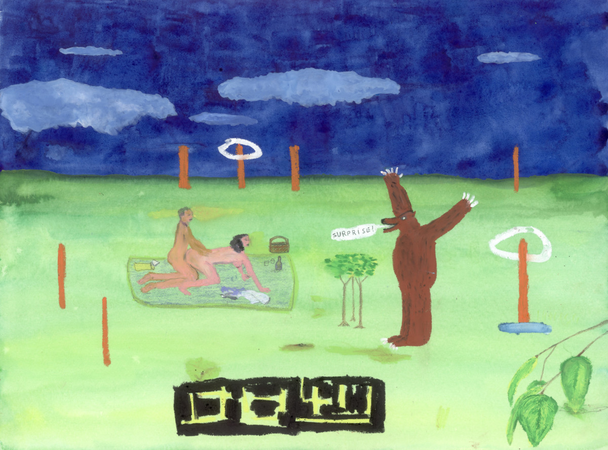 С такой подписью в 2006 году Роман Яценко из Донецка опубликовал на форуме dirty.ru картину американского художника Джона Лури с медведем, подкрадывающимся к паре, которая занимается сексом на природе. Уже в следующем году мем отметит круглую дату — 20 лет!