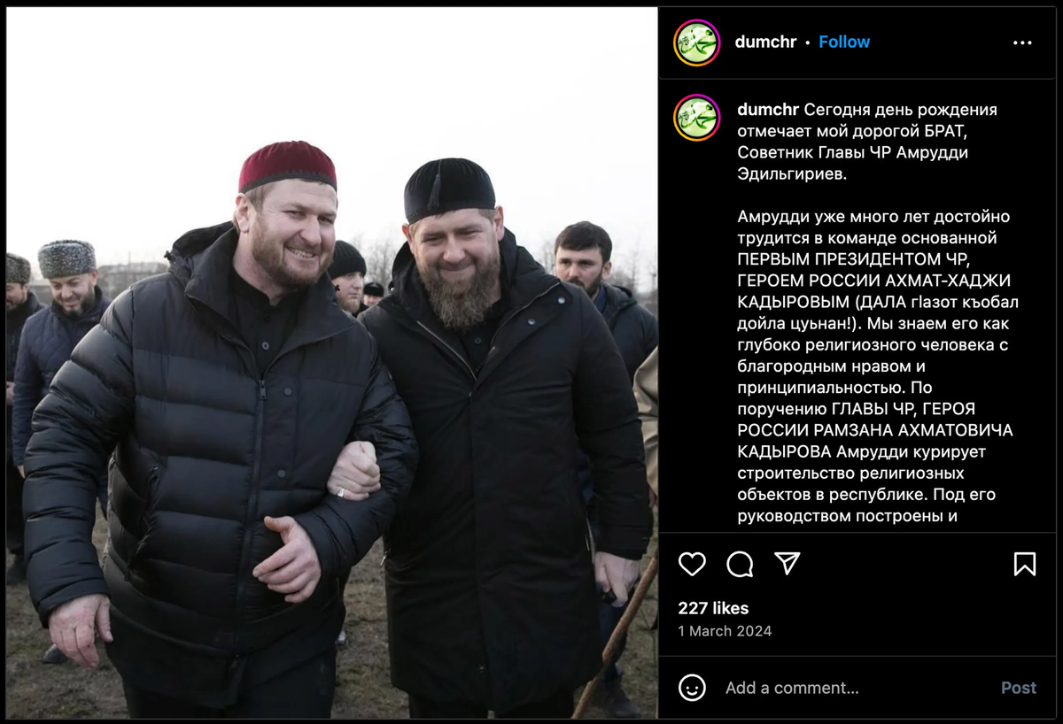 “This is a person I have known very well since childhood. <...> Shahruddi is a representative of a very worthy and respected family in the region and beyond. <...> Shahruddi Akhmedovich is a very responsible, kind, sympathetic, and sincere person who always works with full dedication for the benefit of the republic,” Kadyrov captioned a joint photograph with Edilgiriev.