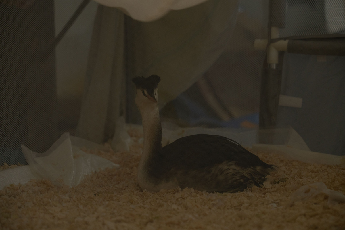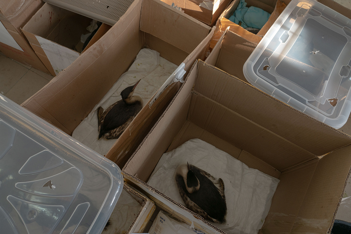 Птицы в коробках сохнут под батареей в штабе на Жемчужной в Витязево. Декабрь 2024. Фото: Марина СычеваОтмытые чомги. Штаб на автомойке в Витязево. Декабрь 2024. Фото: Марина СычеваЧомга в вольере с опилками в «госпитале» на Жемчужной. Январь 2025. Фото: Марина Сычева