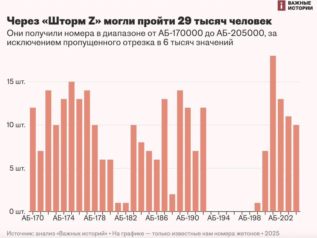 Сопоставив эти данные журналисты пришли к выводу, что в период с апреля по август 2023 года в «Шторм Z» были завербованы от 28,2 до 29 тысяч заключенных. После того, как осужденных стали набирать в отряд «Шторм V», нумерация их жетонов стала совпадать с той, которая всегда присваивалась остальным военнослужащим Минобороны РФ. При этом в расчет не попал период вербовки в колониях с февраля по апрель 2023 года. По мнению авторов исследования, общее количество заключенных, прошедших через «Шторм Z», может превышать 30 тысяч человек.