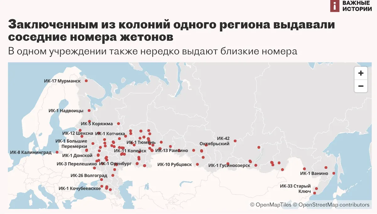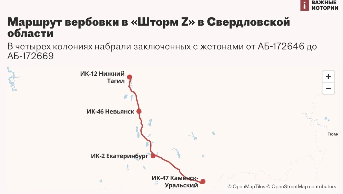 «Важным историям» также удалось по номерам жетонов, которые выдавались заключенным, отследить часть маршрута вербовщиков по российским колониям. Так, жетон с номером АБ-172646 был выдан ИК-12 в Нижнем Тагиле, соседний номер АБ-172647 — в ИК-46 в Невьянске, АБ-172654 — в ИК-2 в Екатеринбурге, АБ-172669 — в ИК-47 в Каменске-Уральском.