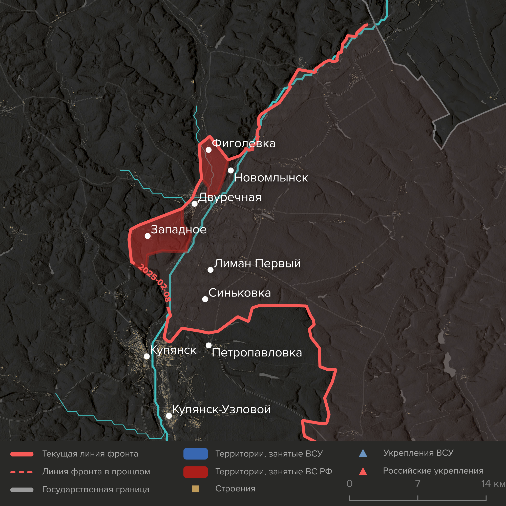 - Ранее ВС РФ заняли поселок Двуречная, а теперь укрепились в селах Западное (к югу от Двуречной), Новомлынск и Фиголевка (к северу от этого поселка). Российским войскам также удалось занять высоты на берегу реки, что облегчит им оборону плацдарма.