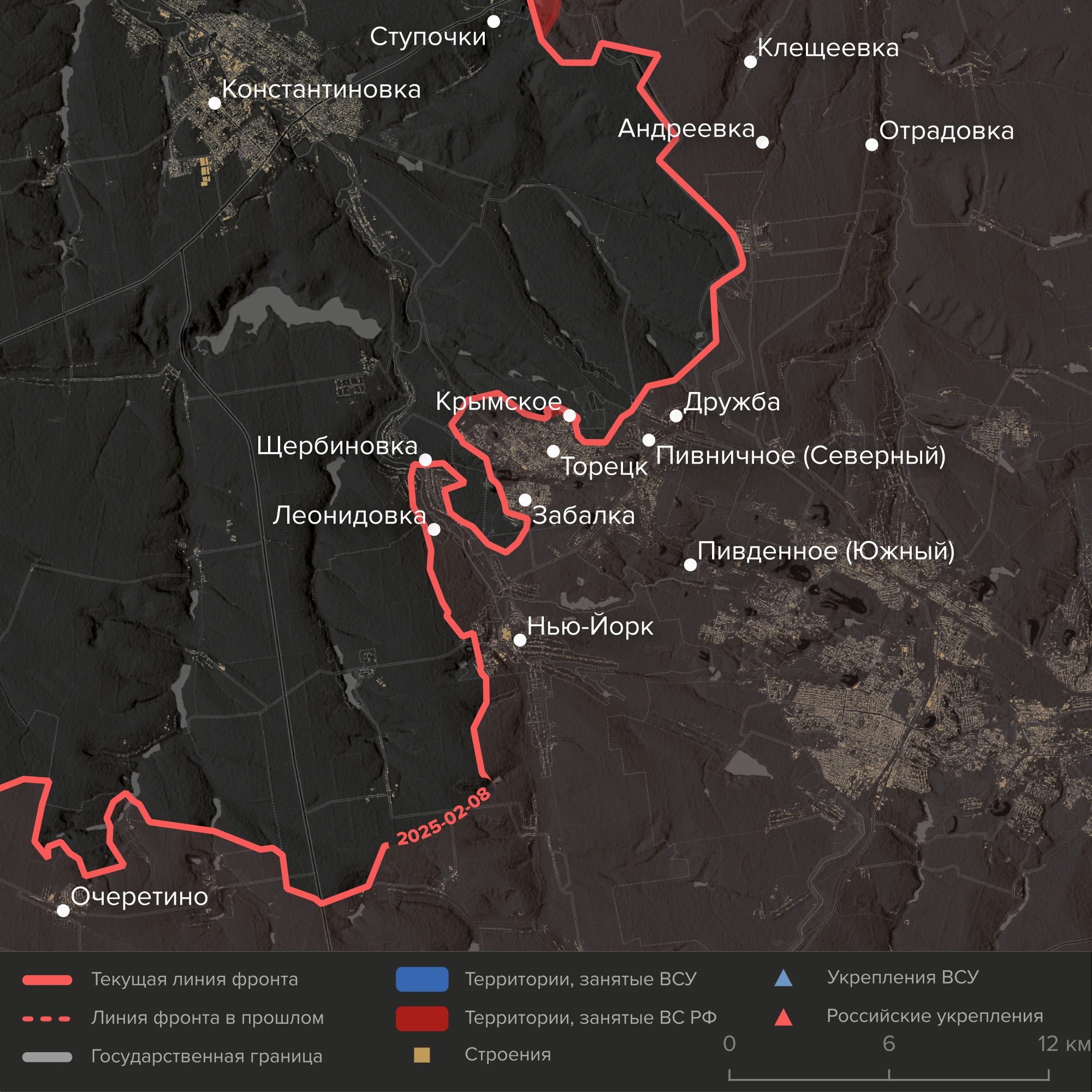 - Минобороны РФ объявило, что российские войска полностью захватили город Торецк. Не ясно, в каких границах ведомство определяет границы города: часть территории соседних рабочих поселков все еще контролируется ВСУ (они входят в состав официальной городской общины Торецк). Однако центр города и северные районы действительно полностью перешли под контроль российской армии.