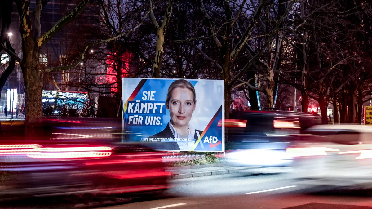 A campaign poster for the far-right party Alternative for Germany (AFD) featuring its candidate for chancellor, Alice Weidel, and reading “She fights for us”, in Berlin, Germany, 17 January 2025. Photo: EPA-EFE / FILIP SINGER