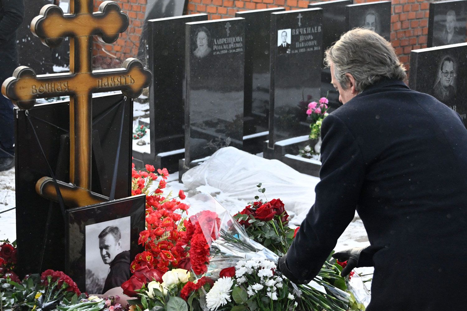 «Медуза» Могила Алексея Навального на Борисовском кладбище в Москве. 16 февраля 2025 года«Медуза» Людмила Навальная у могилы сынаMeduza Очередь к Борисовскому кладбищуЕвгения Новоженина / Reuters / Scanpix / LETAЧитатель «Медузы»Алексей Неменов / AFP / Scanpix / LETA Среди прочих цветы к могиле Алексея Навального 16 февраля возложили западные дипломаты: посол Великобритании в РФ Найджел Кейси, посол США в России Линн Трейси и посол Евросоюза в РФ Ролан Галараг«Медуза»