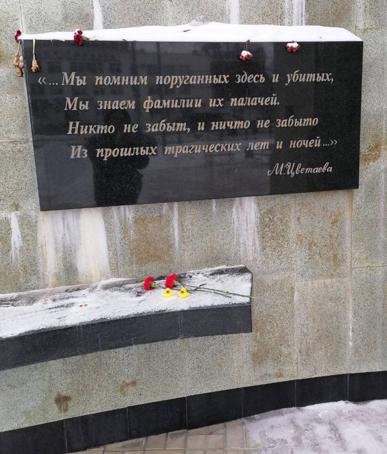 Читатель «Медузы» В Томске возле памятника жертвам политических репрессий дежурят полицейские, поэтому люди оставляют цветы поодаль от мемориала