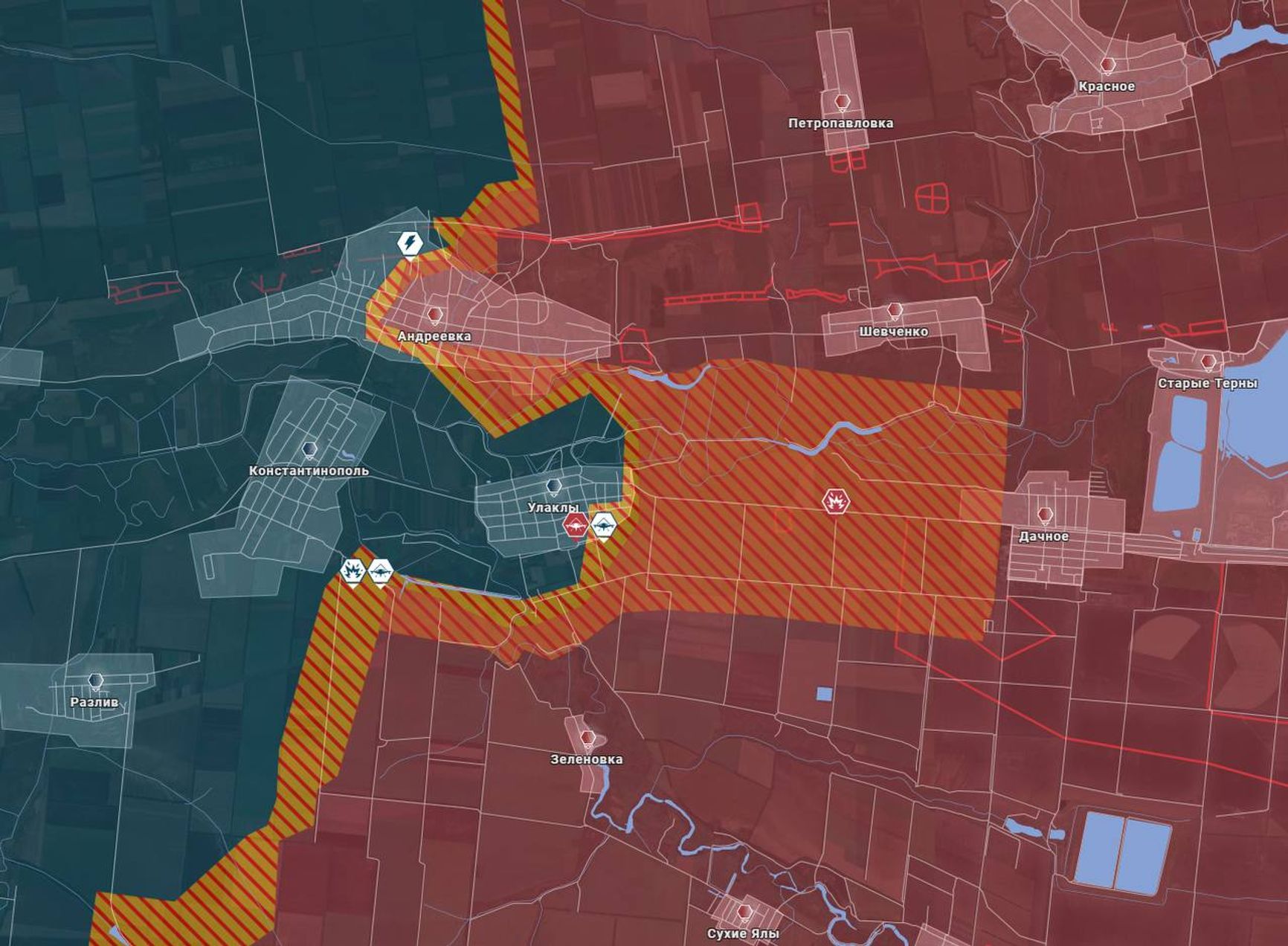 DeepState сообщает (1, 2, 3) о продвижении ВС РФ около Зеленовки, Дачного, в Андреевке и на выходе к Улаклы. Аналитики проекта пишут о массированных атаках на Константинополь и Улаклы с применением бронетехники. По их данным, штурмы начались утром 16 февраля, в результате российская пехота смогла рассредоточиться на южных окраинах Константинополя, а после ВСУ провели там «стабилизационные действия». В DeepState выражают уверенность, что ВС РФ «пока что» не дадут закрепиться в этом селе.