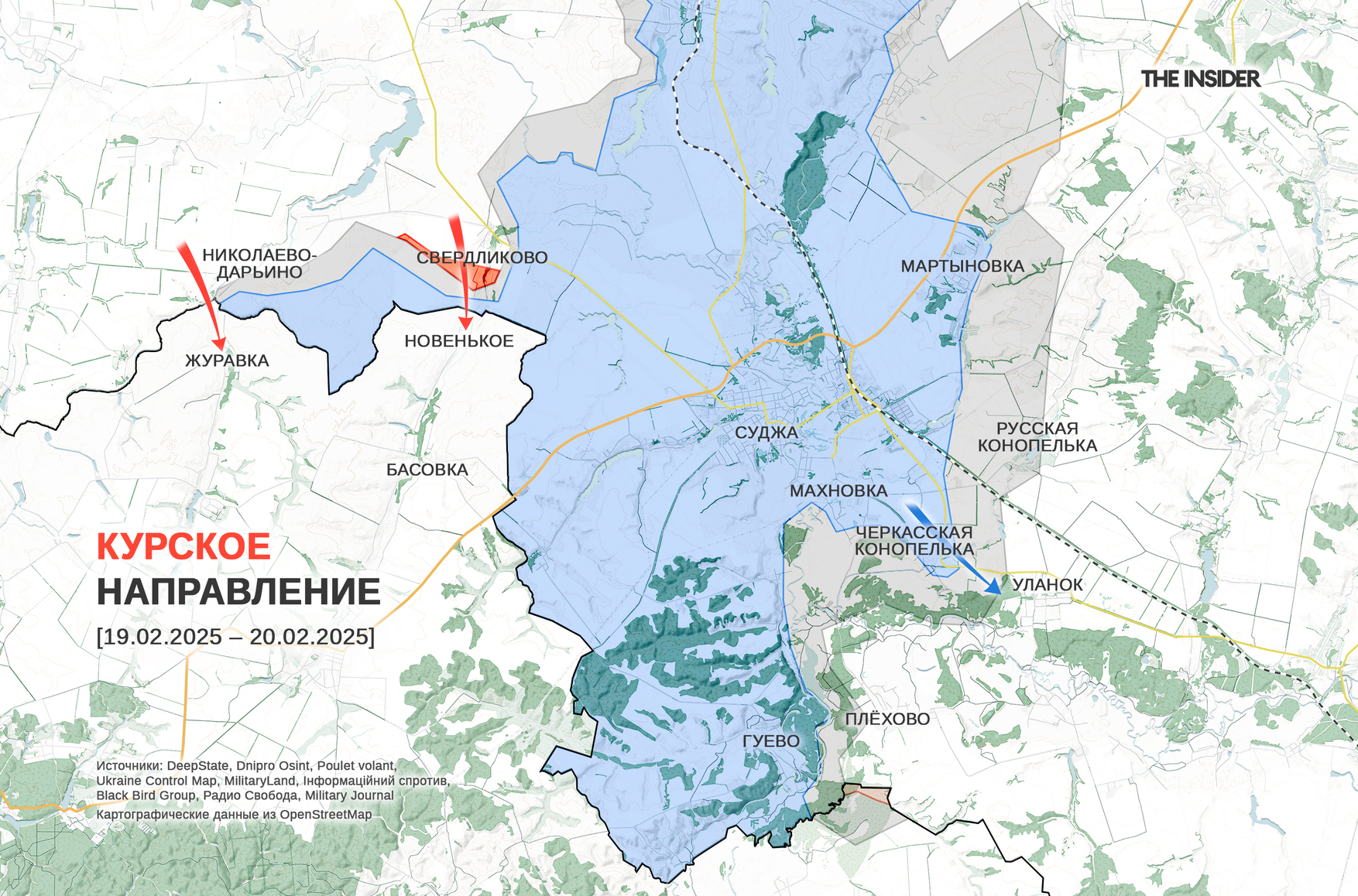 Накануне Владимир Путин рассказал о пересечении бойцами 810-й ОБрМП государственной границы в Курской области и выходе «на территорию противника», то есть, в Сумскую область. «Военкор» Юрий Котенок написал, что после взятия Свердликова ВС РФ атакуют Новенькое с перспективой выхода к главной трассе, по которой идет снабжение курской группировки ВСУ. Никаких визуальных подтверждений Котенок не привел, а вот с украинской стороны выложено видео неудачной попытки пересечь границу Сумской области на участке западнее Новенького рядом с Журавкой (геолокация).