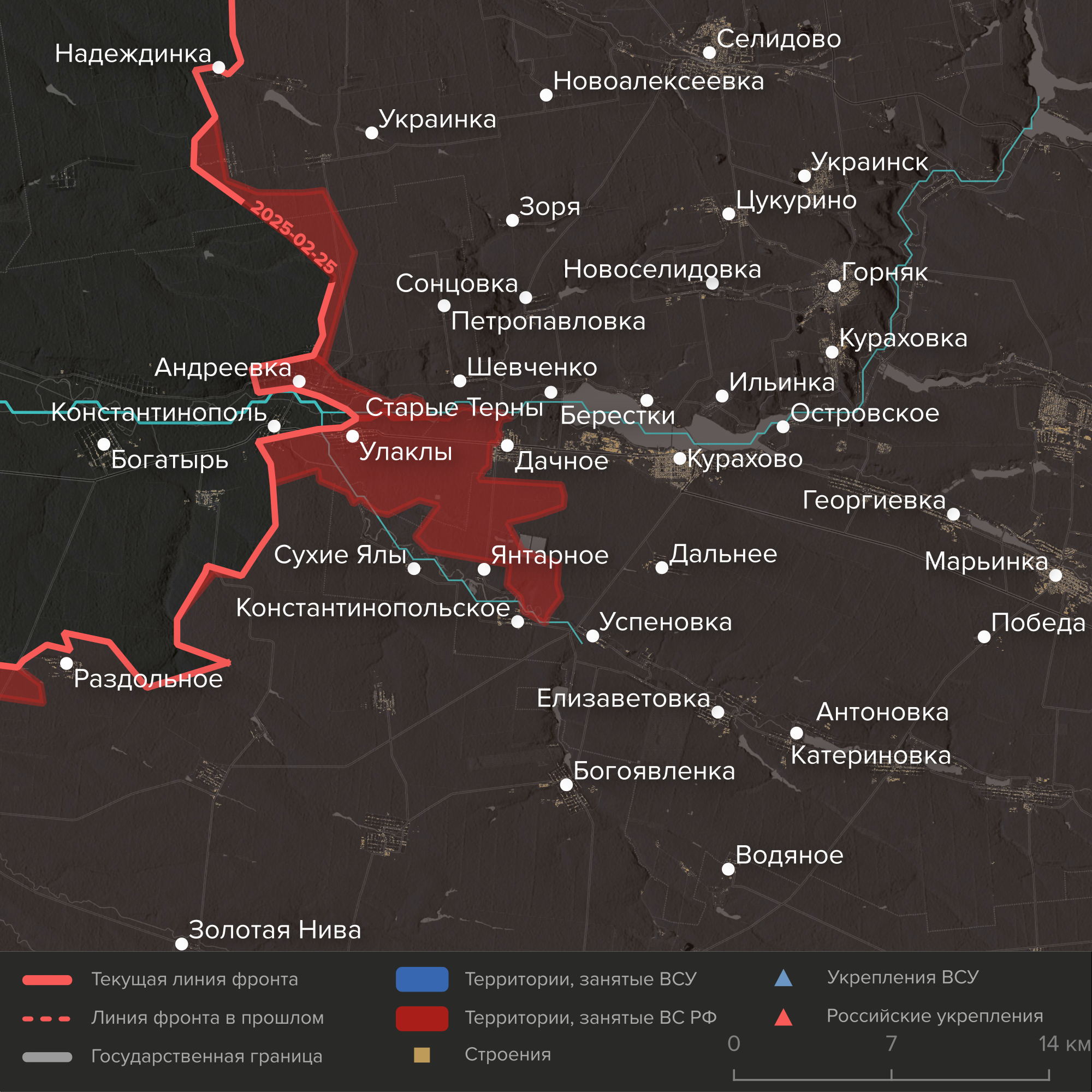 Российские войска начали новую фазу наступления в Донбассе. К концу февраля фактически завершена операция под Курахово: ВС РФ выбили ВСУ с западных окраин города. При этом украинским подразделениям снова пришлось выходить из окружения. Теперь войска из-под Курахово перебрасываются на север, на линию Покровск — Торецк. Вероятно, следующей целью наступления станет город Константиновка — самый южный населенный пункт в агломерации Славянска и Краматорска. Одновременно ВС РФ приблизились к главному пути снабжения ВСУ в Курской области — дороге Суджа — Сумы. В ближайшие недели они попробуют окружить украинскую группировку в Судже (или вынудить ее уйти в Сумскую область).