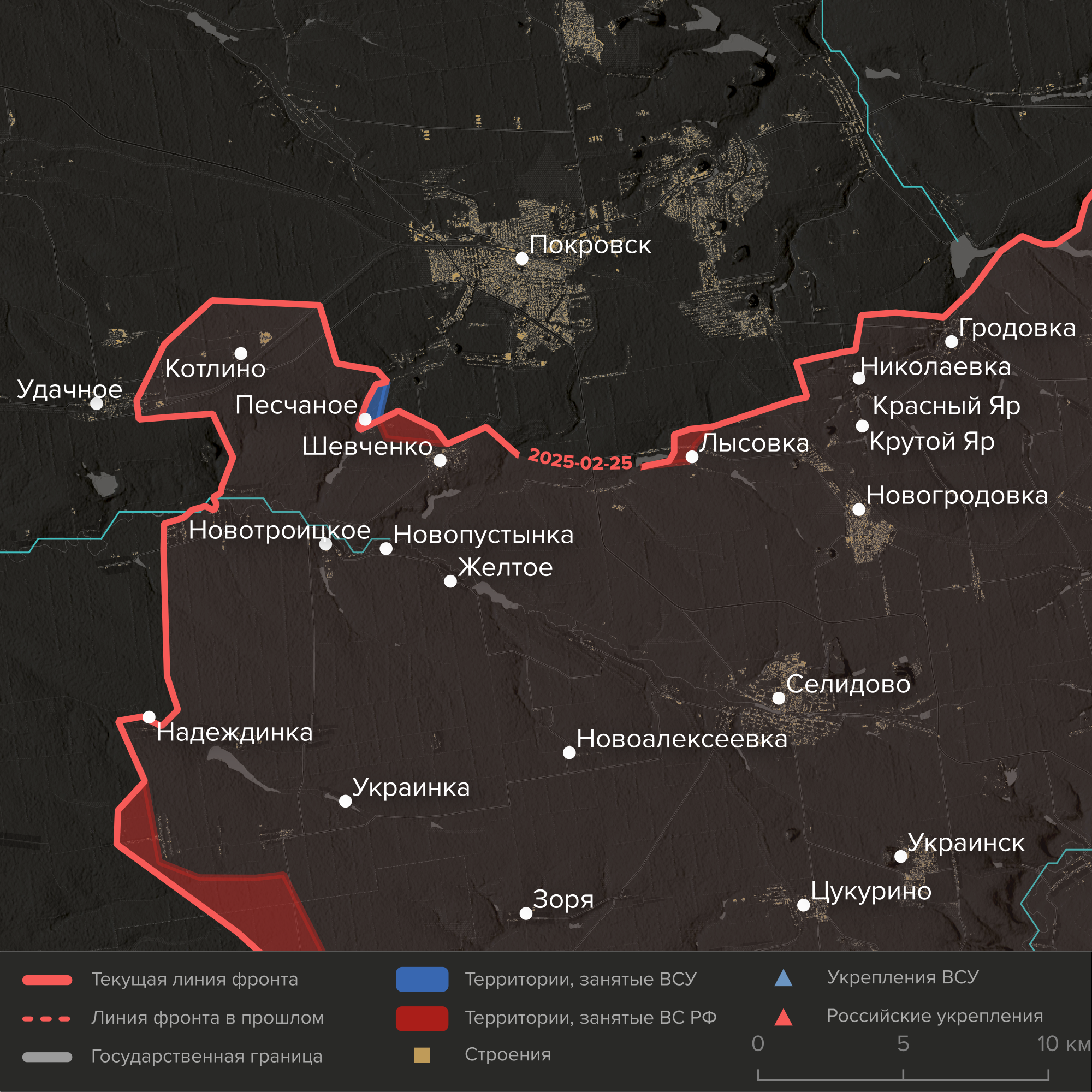 После украинских контратак начала февраля в селе Песчаное к югу от Покровска идут упорные встречные бои. ВС РФ смогли отбить промзону на востоке села, ВСУ закрепились в жилой застройке на севере
