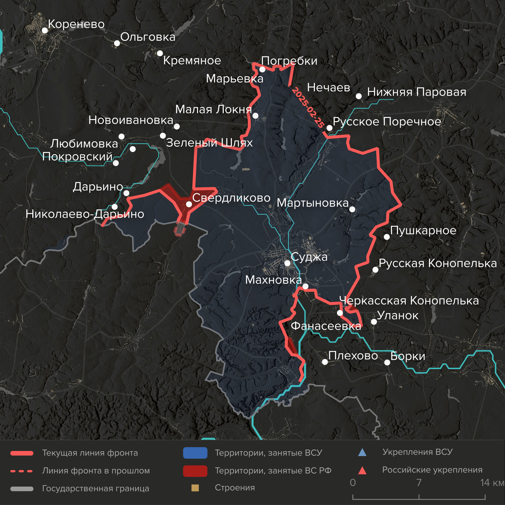 - В то же время резко осложнилось положение ВСУ к западу от Суджи. Российские войска заняли село Свердликово, через которое идет одна из дорог из Сумской области Украины. По сообщениям российских источников, ВС РФ сами пересекли границу Сумской области и двинулись к дороге Суджа — Сумы. Это основная линия снабжения плацдарма ВСУ. Но подтверждений этим заявлениям пока так и не появилось.