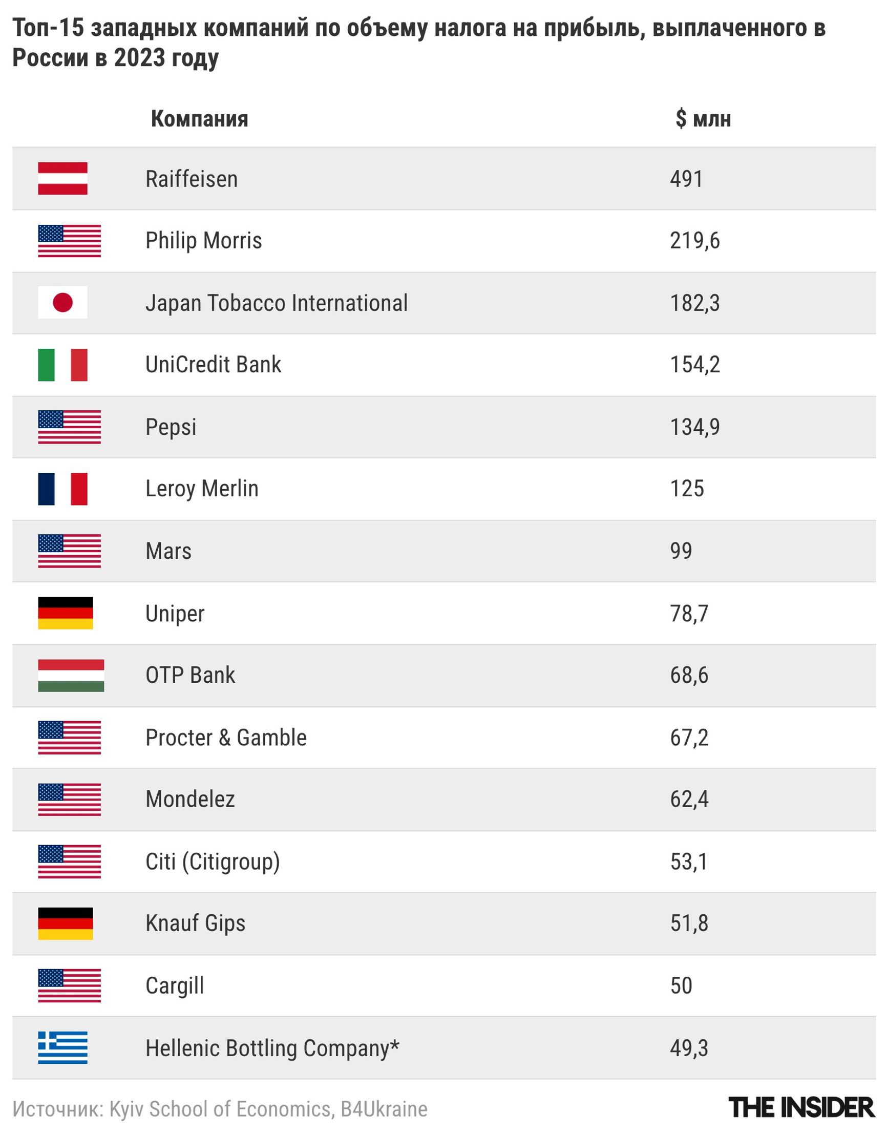 Оставаясь в России, компании, которыми владеют граждане западных стран, не только зарабатывают на войне сами, но и обеспечивают наполнение российского военного бюджета. Подсчеты The Insider говорят, что суммарные поступления их налогов составили примерно полтриллиона рублей, или $4,85 млрд в 2023 году. Для сравнения, всех ненефтегазовых налогов в бюджет тогда поступило 20 трлн рублей. Только налог на прибыль этих компаний обеспечил военному бюджету не менее 111 млрд рублей ($1,3 млрд).