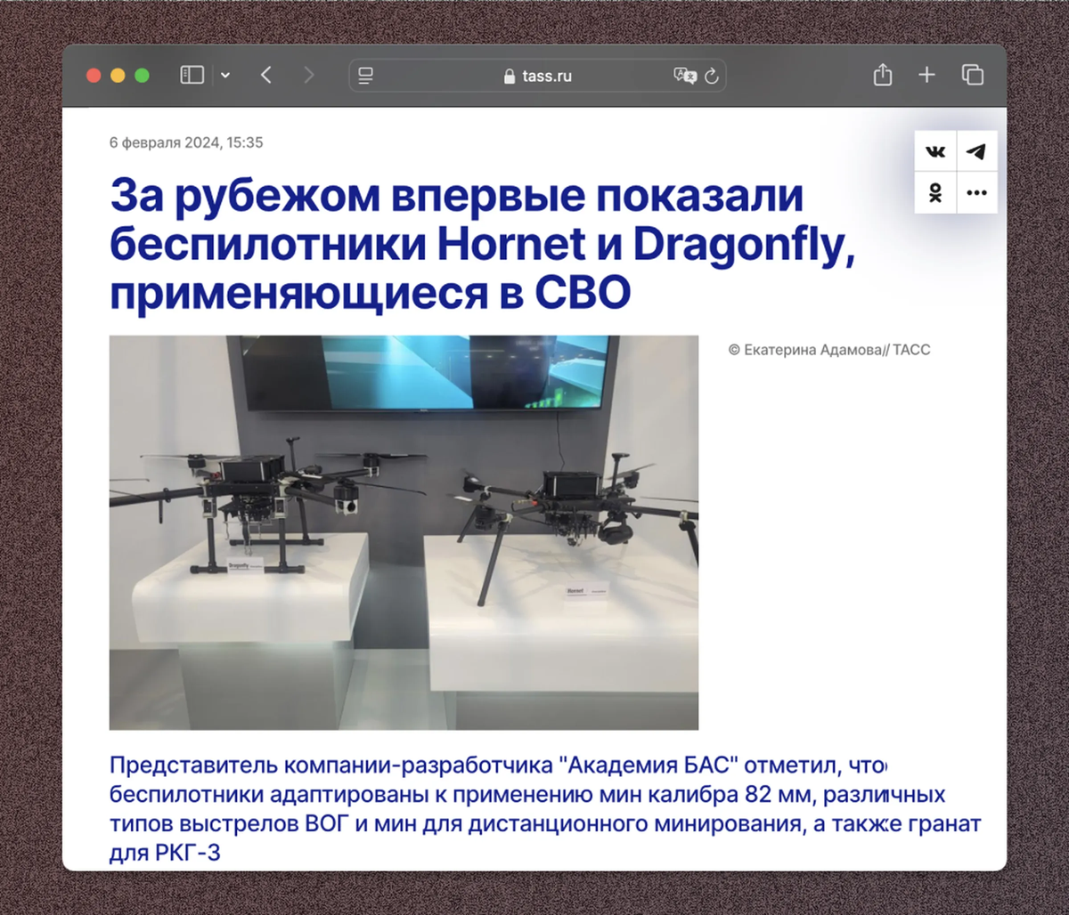 There is no registered company with such a name in Russia, according to the legal entities register. However, IStories found a mention of ABAS on the Future Lab website. The Hornet and Dragonfly drones from ABAS are outwardly identical to the models that Future Lab produces under the names Mukha and Muravey.