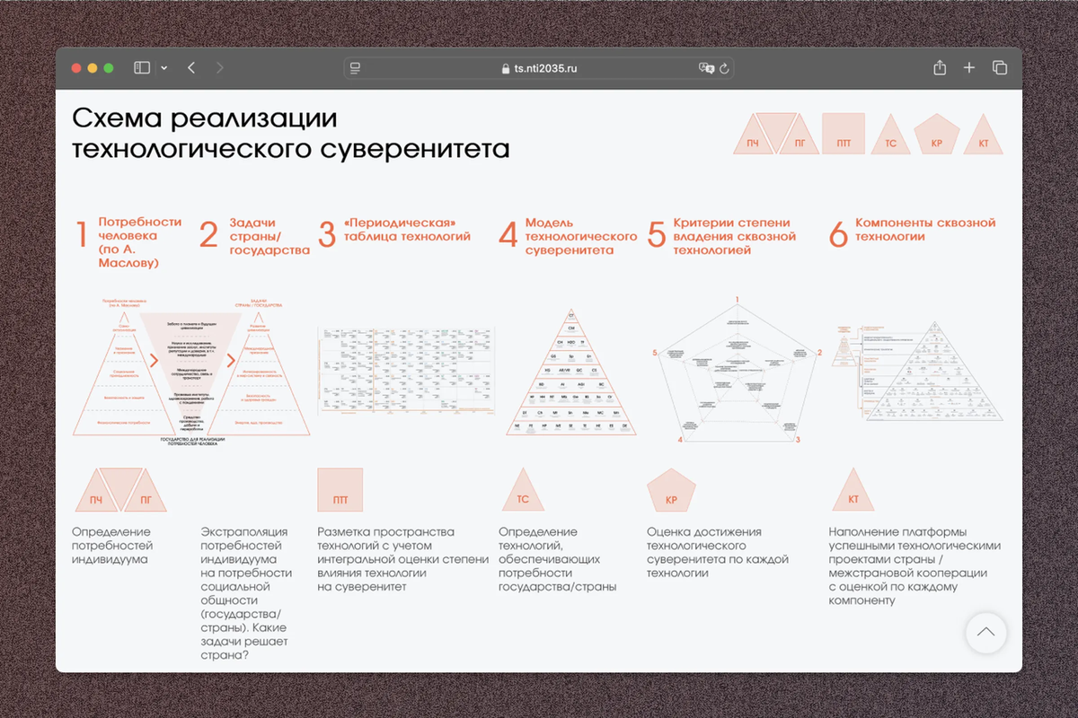 The method of implementing “technological sovereignty” is presented in the form of various diagrams: for example, Maslow’s hierarchy of needs (on the NTI website, he is somehow listed as “Maslov”) and Mendeleev’s periodic table — only with technologies instead of chemical elements.