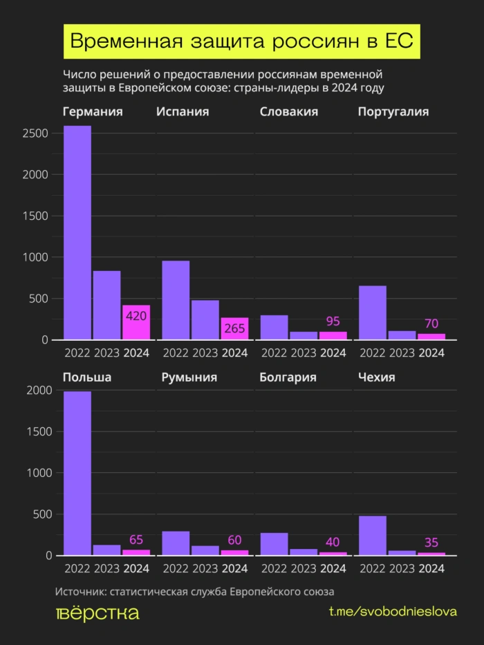 Лидером по предоставлению временного убежища, как и предыдущие два года, по-прежнему остаётся Германия. В 2024 году в стране временную защиту получили 420 россиян — почти в 6,2 раза меньше, чем в 2022 году, когда защиту предоставили 2 590 гражданам России. На втором месте Испания — 265 решений о предоставлении временной защиты (в 2022 году было 955). На третьем месте Словакия — 95 решений (в 2022 году было 295).