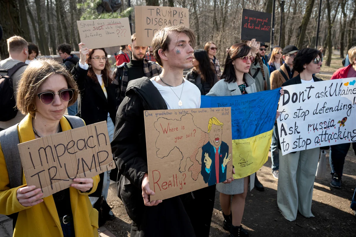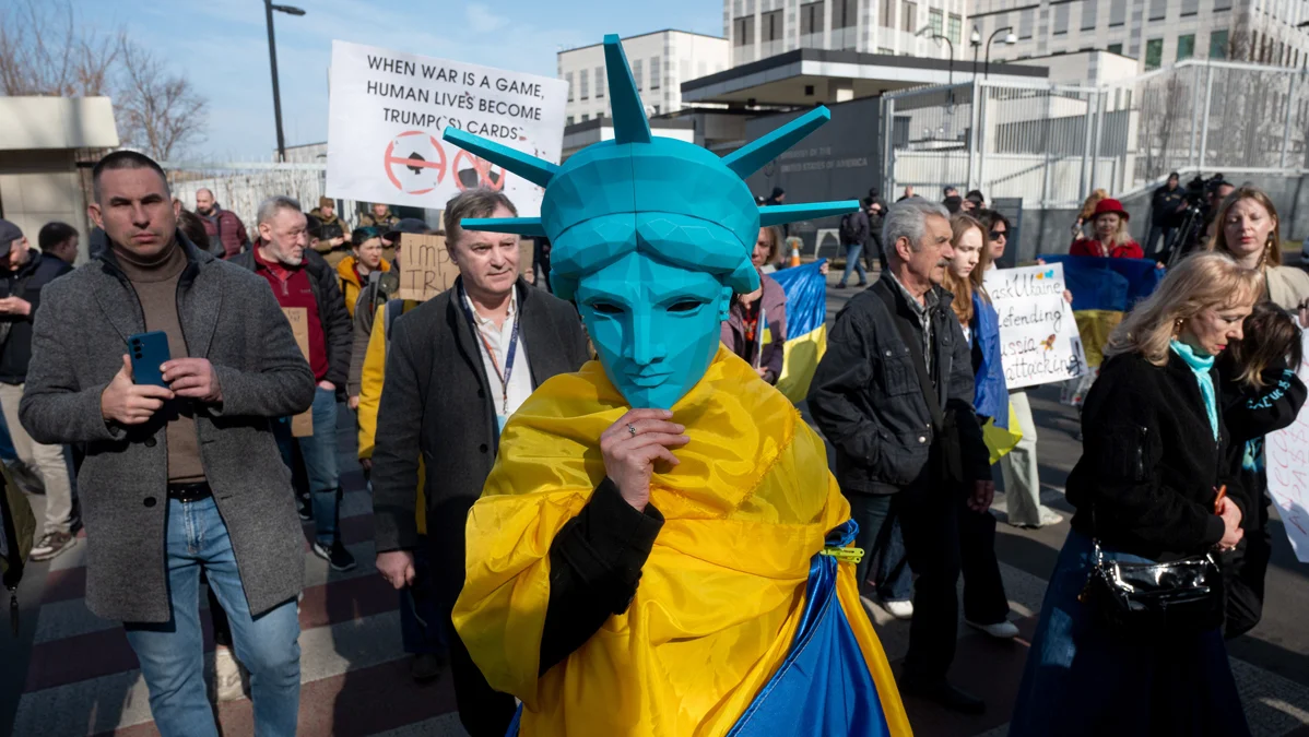 Участники акции «Америка, проснись!» у посольства США в Киеве, Украина, 8 марта 2025 года. Фото: Danylo Antoniuk / Ukrinform / Shutterstock / Rex Features / Vida Press