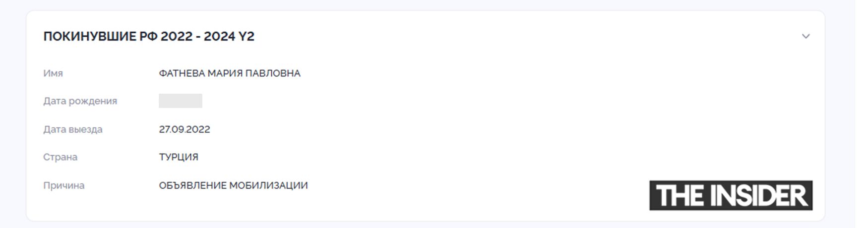 При этом слитые базы данных относят Фатневу к россиянам, покинувшим страну после начала полномасштабного вторжения России в Украину. Эта классификация появилась прошлым летом и объединила всех граждан России, уехавших из страны в 2022 или 2023 годах. 21 сентября 2022 года в России объявили мобилизацию. Судя по данным из системы бронирования авиабилетов «Сирена-Трэвел», 25 сентября Фатеева купила билет в Бодрум на 27 число, то есть всего за два дня до поездки.