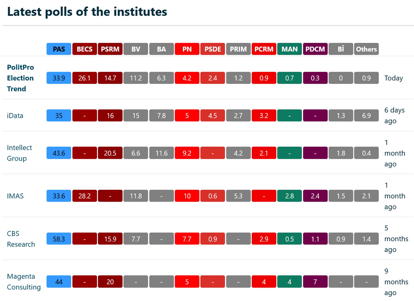 То есть во всех опросах PAS уверенно занимает первое место, а ее пророссийским соперникам — Партии социалистов (возможно, в блоке с растерявшей популярность Партией коммунистов) и блоку «Победа», с которым связана Евгения Гуцул, — не хватит мест в парламенте, чтобы сформировать правительство. Агентство Infotag сообщает о представленных на прошлой неделе результатах опроса iData, по которым, если бы выборы проводились сейчас, PAS получила бы 45 из 101 места в парламенте, социалисты — 21, «Победа» — 19, блок «Альтернатива» примара Кишинева Иона Чебана — 10, «Наша партия» Ренато Усатого — 6. В этом случае формирование правительства зависело бы от того, удастся ли PAS создать коалицию с левоцентристской «Альтернативой», которая резко критикует действующее правительство, но на референдуме о евроинтеграции поддержала позицию правящей партии.