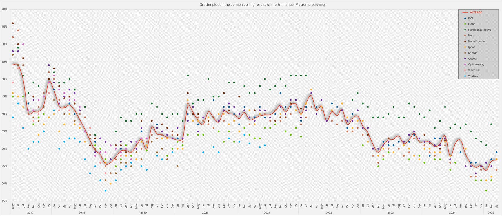 В действительности рейтинг одобрения у Макрона сейчас не самый высокий за время его нахождения у власти, но и не тот, о котором говорит Киселев: разные опросы в марте дают ему от 24% до 29%.