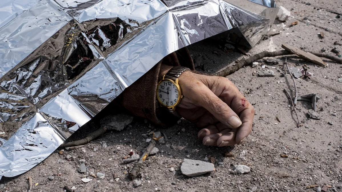 Тело погибшего после российского ракетного удара по Сумам, 13 апреля 2025 года. Фото: Volodymyr Hordiienko / AP Photo / Scanpix / LETA
