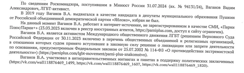 Вадим Ваганов в разговоре с «Новой-Европа» подчеркнул, что Минюст причислил его к участникам «движения» из-за работы с порталом о квир-людях «Парни плюс» — в справке от ведомства указывается ссылка на его профиль автора. Также ведомство включило его в несуществующее сообщество из-за шуточного поста про ЛГБТ-инструктаж и квир-рекомендаций к президентским выборам в 2024 году.