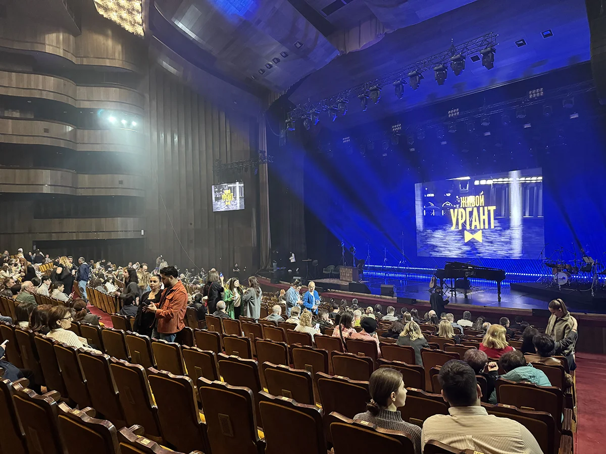 На сцене весь вечер был комик и сценарист Александр Гудков, долгие годы бывший соведущим «Вечернего Урганта». Гудков в 2022 году выпустил песню и клип «Я — узкий», пародию на творчество Z-певца Shaman. Из-за отъезда (а потом, вероятно, возвращения в Россию) его также требовали признать «иноагентом».