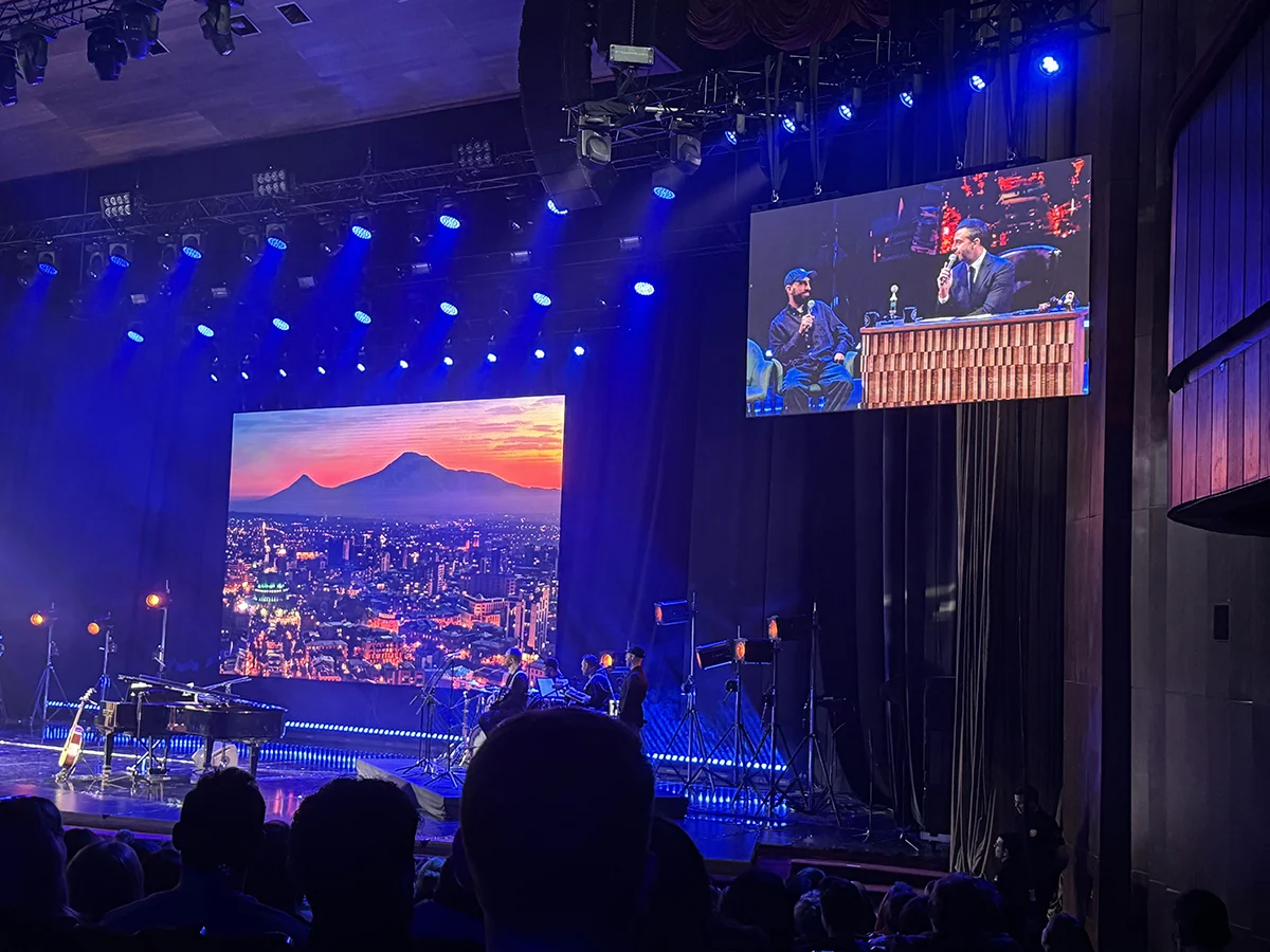 Местные гости на сцене (после Еприкян на сцену поднялись главный дирижер Армянского государственного театра оперы и балета Карен Дургарян и врач-косметолог Кристина Бабаян), чередовались c воспоминаниями и разговорами о России.