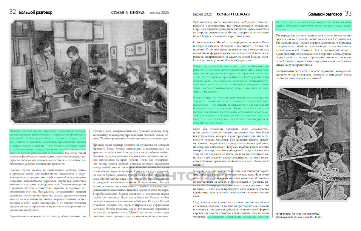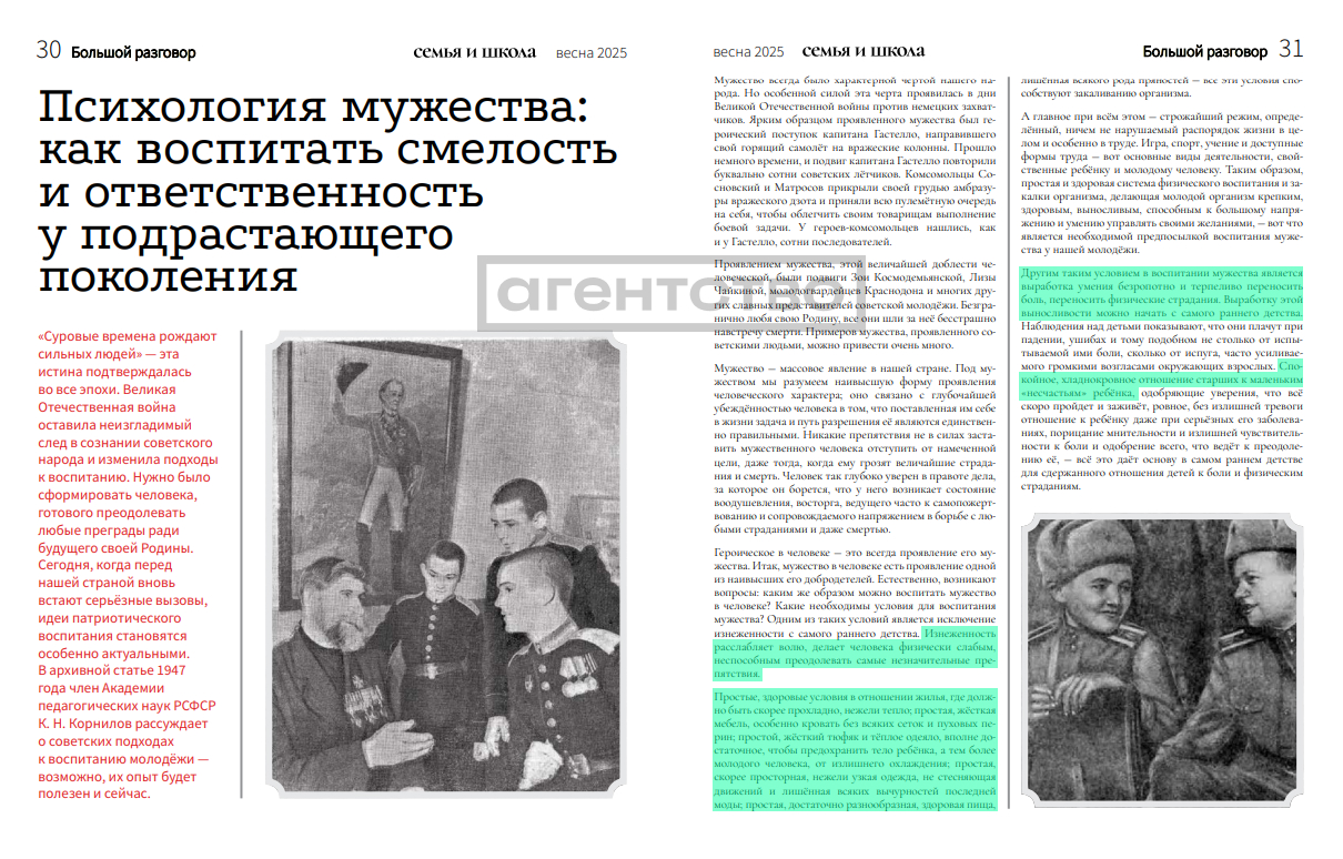 Детали. Необходимость перепечатки статьи 1947 года издание объясняет схожестью времен: «Сегодня, когда перед нашей страной вновь встают серьёзные вызовы, идеи патриотического воспитания становятся особенно актуальными. В архивной статье 1947 года член Академии педагогических наук РСФСР К. Н. Корнилов рассуждает о советских подходах к воспитанию молодежи — возможно, их опыт будет полезен и сейчас». Великая Отечественная война изменила подходы к воспитанию в СССР, на первый план вышло формирование человека, «готового преодолевать любые преграды ради будущего своей Родины», говорится в тексте, который предваряет перепечатку.