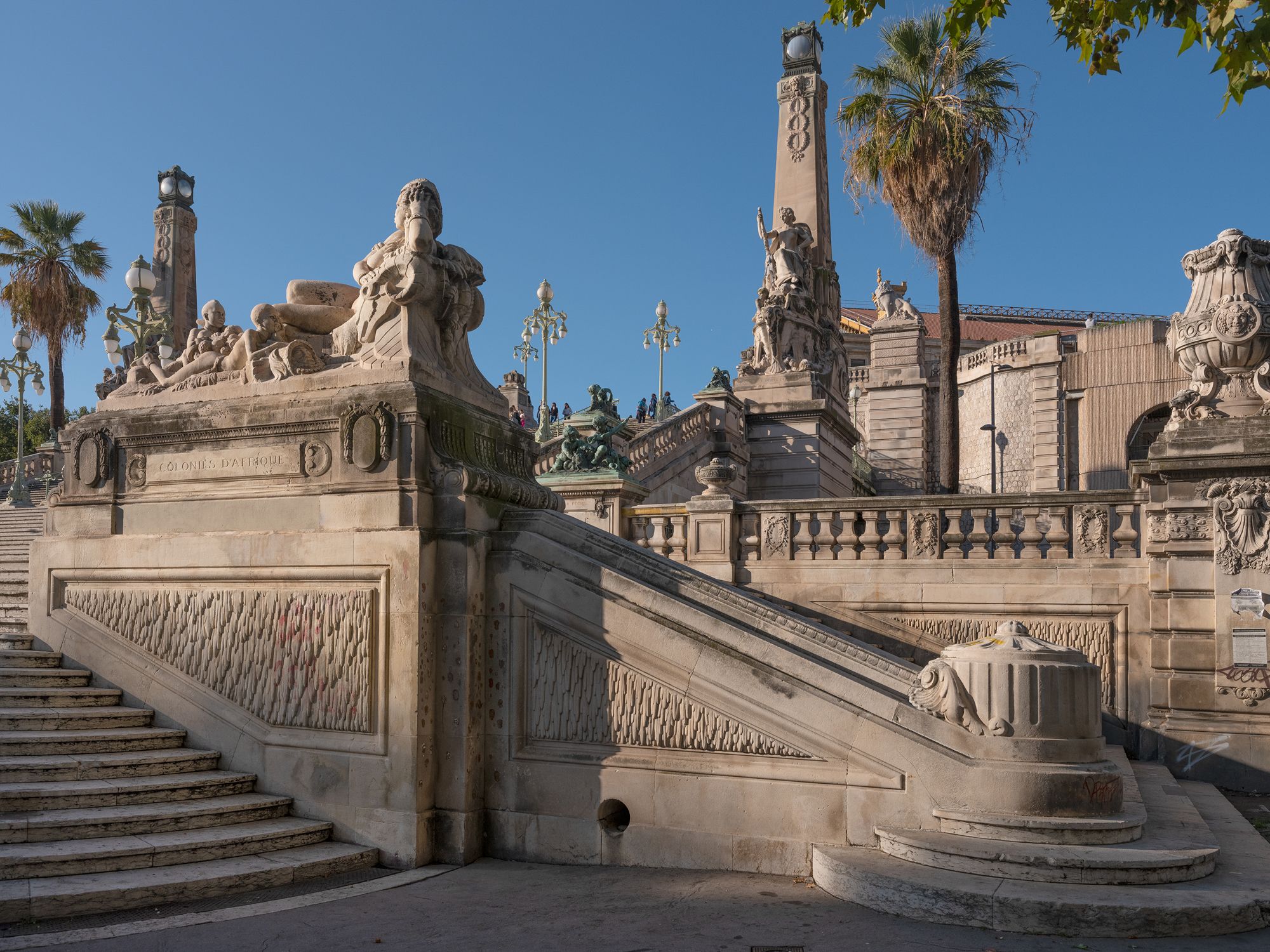 Все, кто приезжают в Марсель поездом, спускаются в город по помпезной лестнице Сен-Шарль. В ее основании установлены две аллегорические скульптурные группы: «Африканские колонии» и «Азиатские колонии». Строительство должны были закончить к Колониальной выставке 1922 года, но открыли только спустя пять лет. Марсель вплоть до 1960-х годов оставался колониальной столицей Франции и «воротами на Восток», а основу его экономики составляла колониальная торговля.