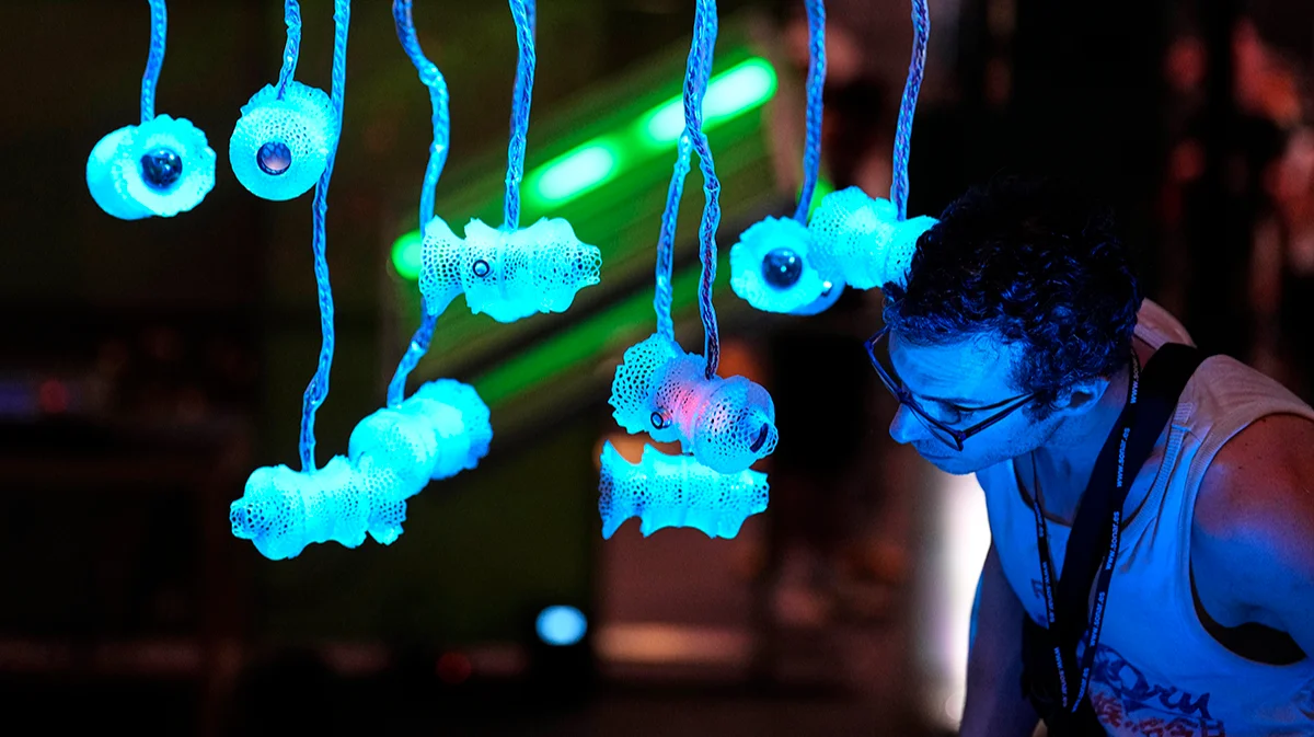 Инсталляция Иоланды Ортис «Химическая экосистема», которая измеряет компоненты воздуха и «переводит» их в звуки и запахи, фестиваль музыки, творчества и технологий Sonar, Барселона, Испания, 15 июня 2023 года. Фото: Alejandro Garcia / EPA-EFE