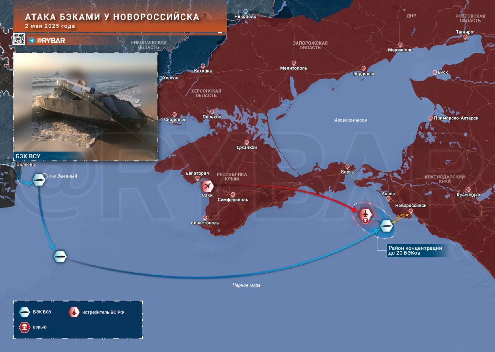 Украинские надводные беспилотники, оснащенные советскими ракетами класса «воздух — воздух», нанесли удар по российскому истребителю Су-30 в районе порта Новороссийск. Об этом сообщило Главное управление разведки Минобороны Украины. Информацию подтверждают Z-каналы, в том числе Telegram-канал «Рыбарь».