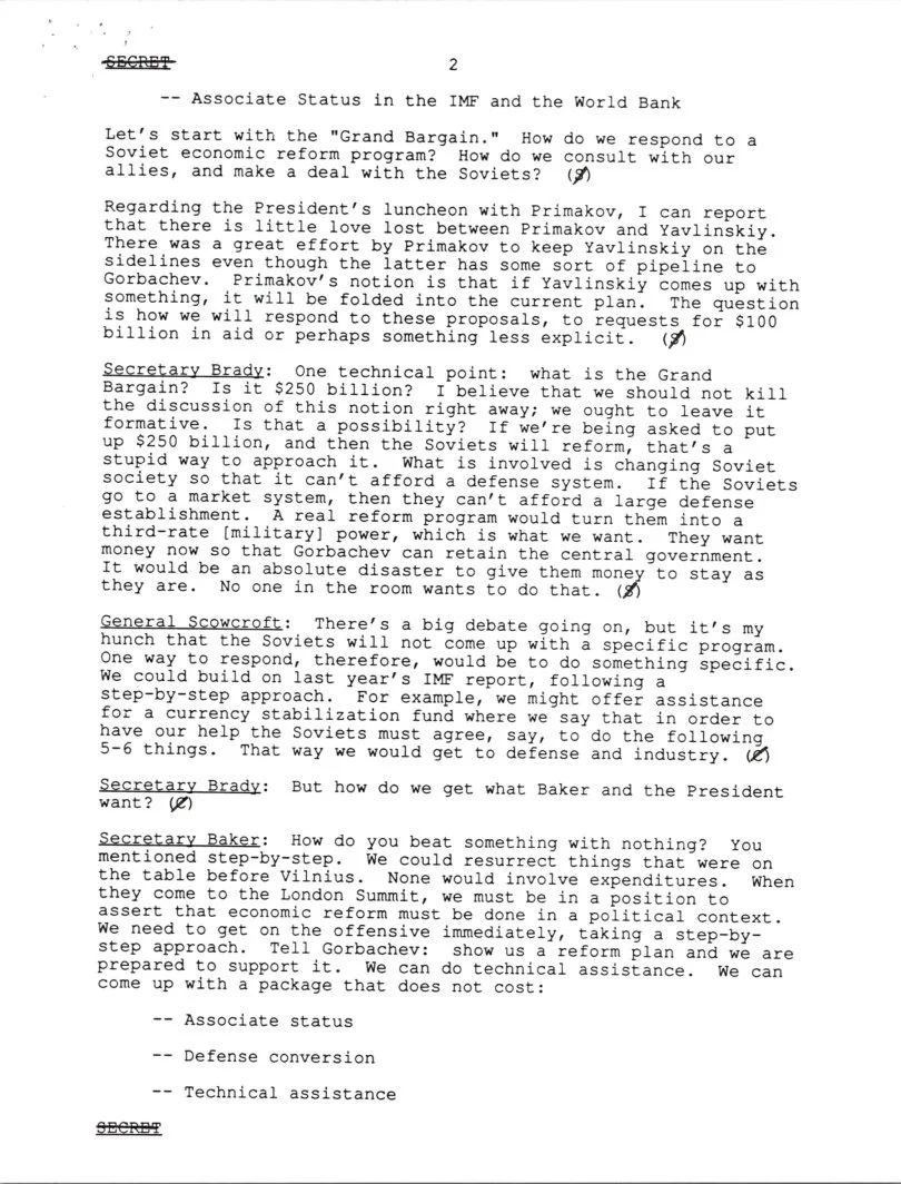 Реальная программа реформ превратит их в третьесортную [военную] державу, чего мы и хотим. Сейчас им нужны деньги, чтобы Горбачев мог сохранить центральное правительство. Было бы абсолютной катастрофой дать им деньги, чтобы все осталось по-прежнему. Никто в этой комнате не хочет этого делать.