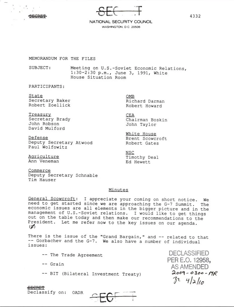 Генерал Скоукрофт: Я ценю, что вы прибыли в столь короткое время. Нам необходимо начать работу, поскольку приближается саммит «Большой семерки». Экономические вопросы — это все элементы общей картины и управления американо-советскими отношениями. Я хотел бы обсудить все вопросы сегодня, а затем представить наши рекомендации президенту. Позвольте мне перейти к ключевым вопросам нашей повестки дня.