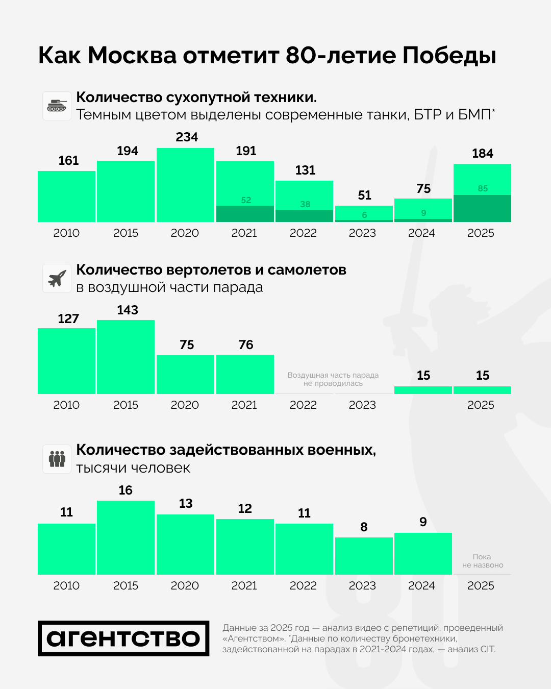 Детали. Согласно видео с репетиций, в параде примут участие не менее 184 единиц техники, 12 беспилотников и 15 самолетов. Это рекорд с начала войны, следует из анализа «Агентства» (см. графику). Больше техники на параде было только в 2021-м.