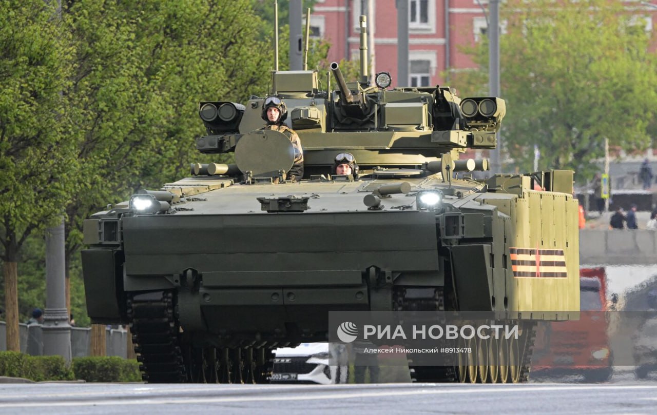 Что покажут на параде. В этом году в параде ожидается полноценное участие современных танков и БМП. В репетиции участвовали 30 танков Т-72Б3М, Т-80БВМ и Т-90М «Прорыв» (видео ниже). 9 мая на Красной площади также появятся 55 БТР и БМП, в том числе БМП-2М с модулем «Бережок», БМП-3, БМП «Курганец-25» (на фото выше) и «Бумеранг». Это один танковый и один мотострелковый батальоны, оценил количество техники аналитик Conflict Intelligence Team (CIT).