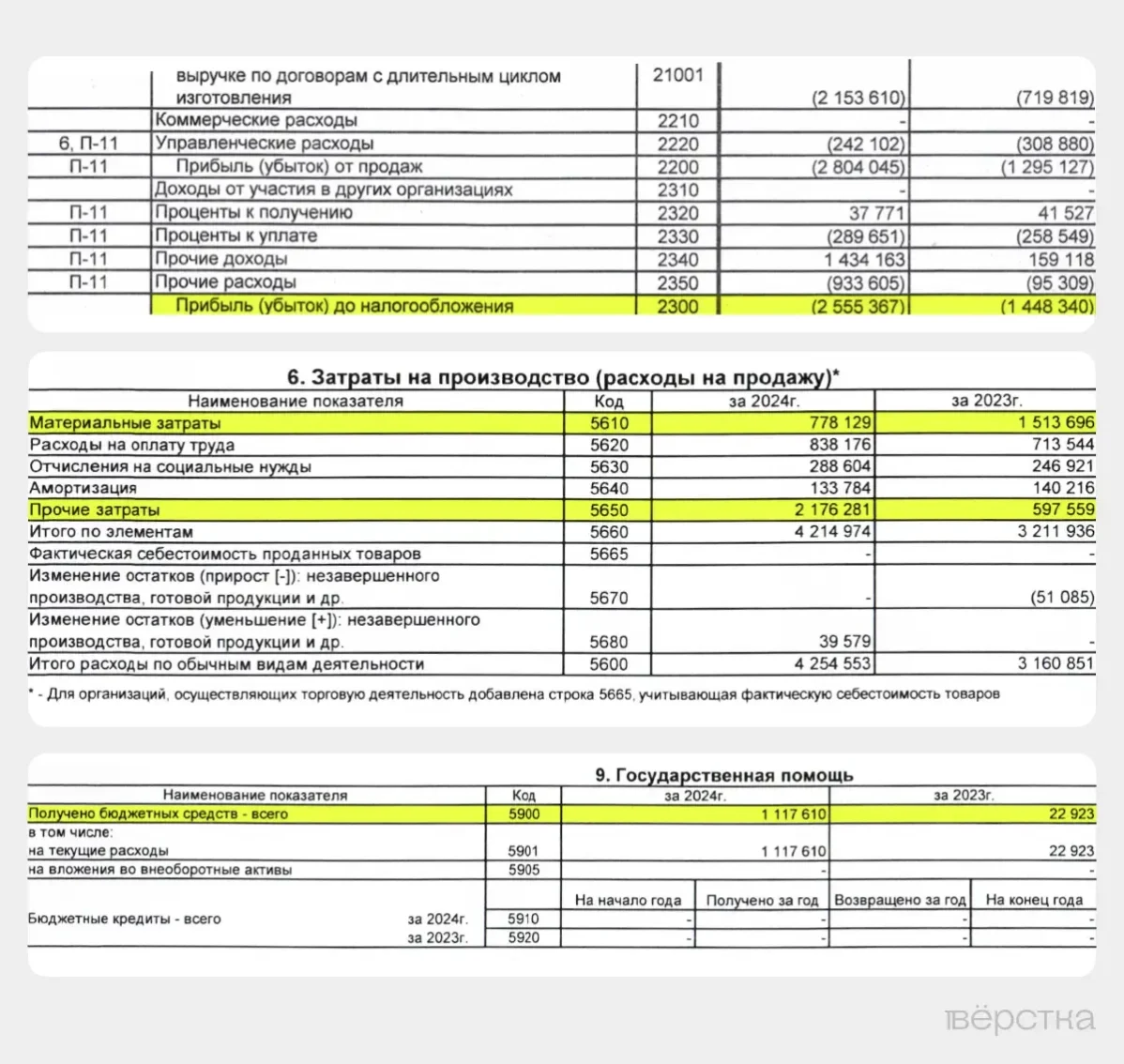 В своей отчётности предприятие не указывает продукцию, которую выпускает для военных нужд. «Вёрстка» обратила внимание, что в 2024 году материальные затраты на производство значительно снизились в сравнении с 2023 годом — на 46%, при этом расходы на оплату труда возросли, как и «прочие затраты», — до 2,2 млрд рублей в сравнении с 597 млн рублей в 2023 году. Кроме того, в прошлом году завод получил госпомощь более чем на миллиард рублей. В 2023 году эта сумма была на порядок ниже.