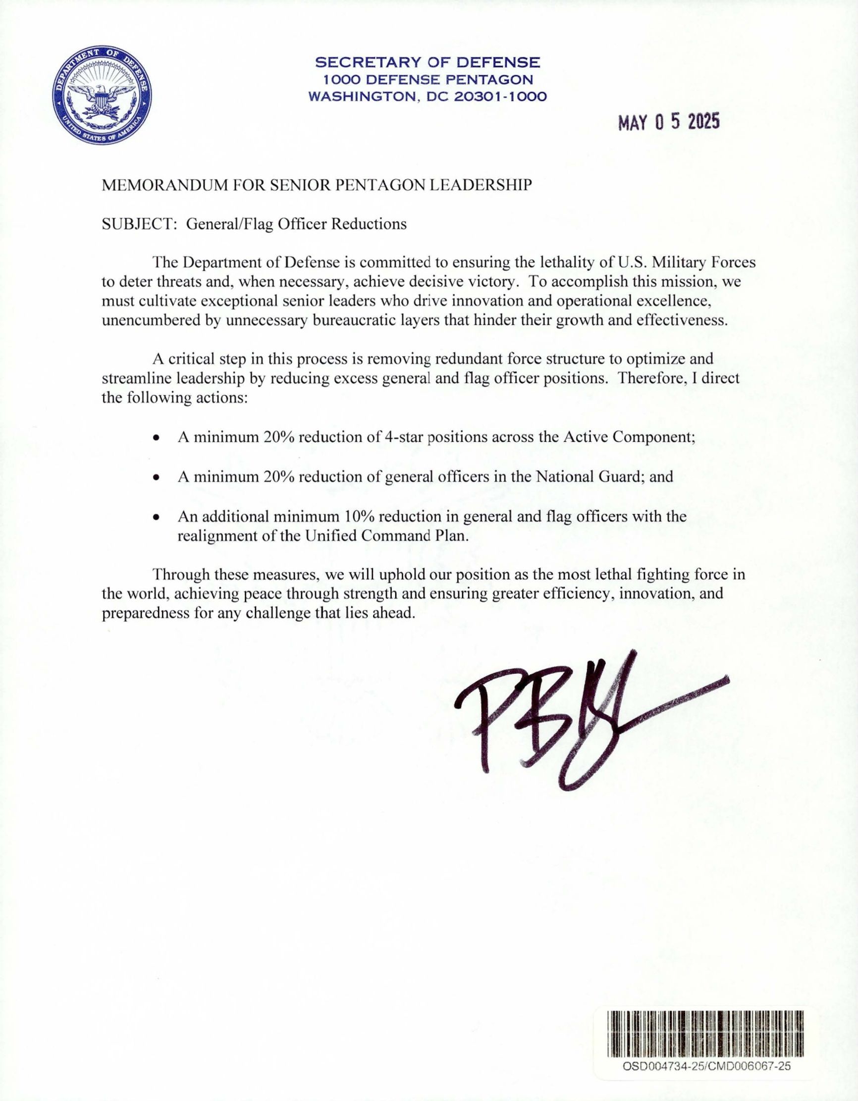 Министр обороны США Пит Хегсет распорядился сократить число четырехзвездных генералов и адмиралов в вооруженных силах США минимум на 20%. Аналогичное сокращение должно затронуть генералов Национальной гвардии. Кроме того, планируется уменьшение на 10% общего числа высших офицеров в рамках реорганизации плана объединенного командования. Документ датирован 5 мая 2025 года и адресован руководству Пентагона.