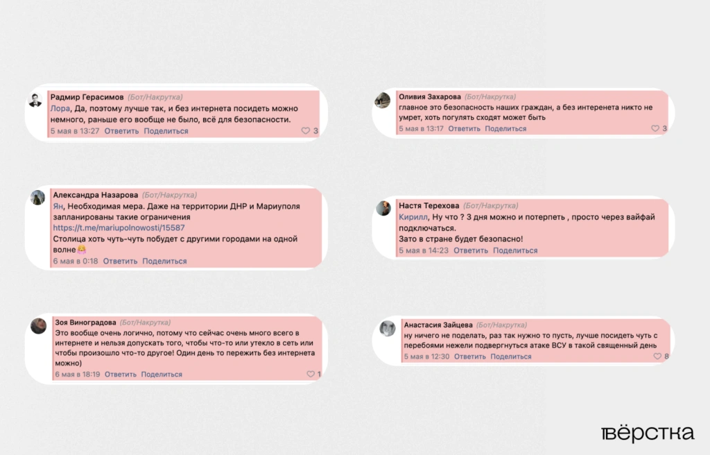 Боты оставляли комментарии с более чем 500 аккаунтов под публикациями провластных СМИ и пабликов во «ВКонтакте». Их основной нарратив — утверждение о том, что ограничения связи вводятся для безопасности россиян, и им стоит перетерпеть временные неудобства.